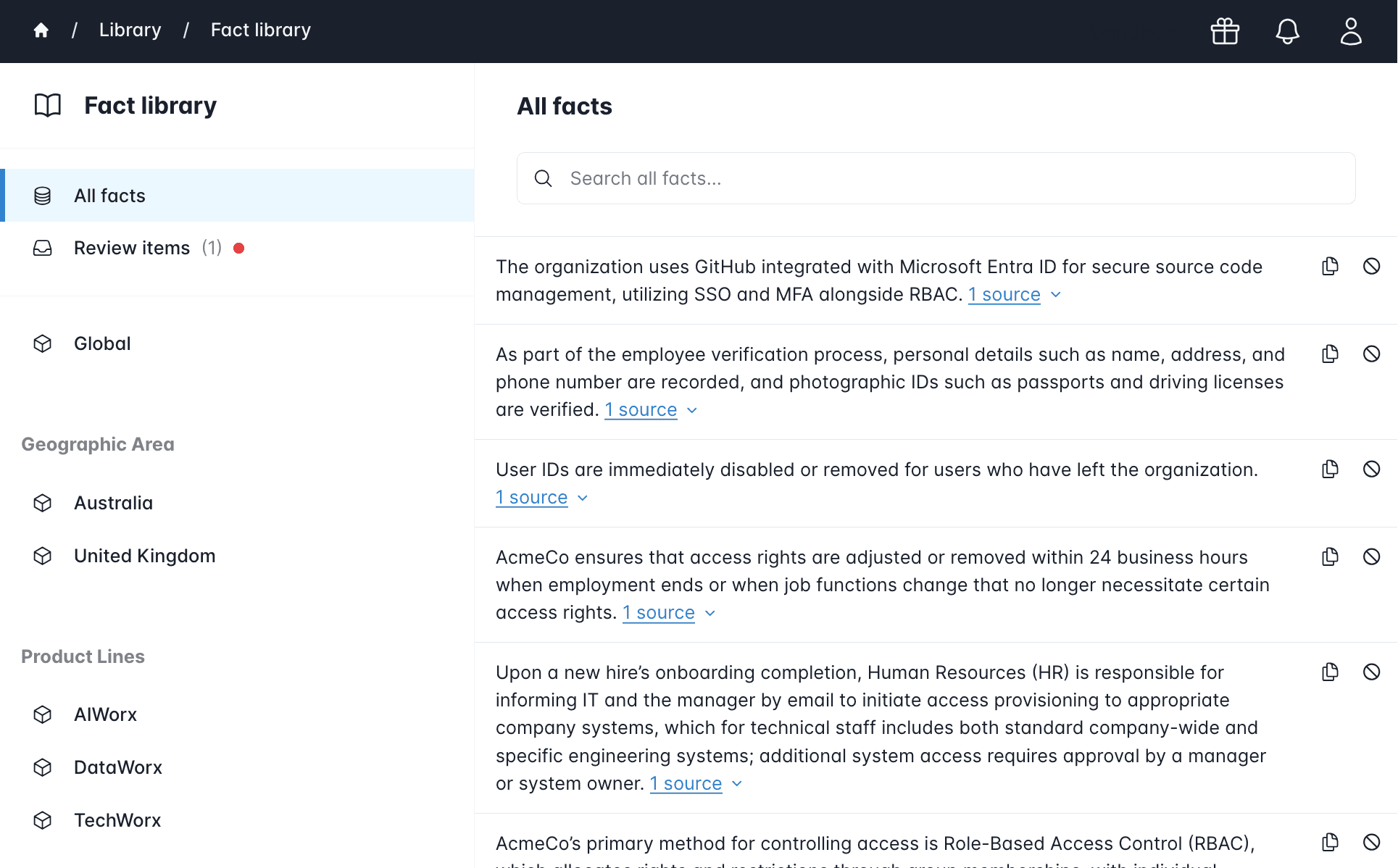 Automatically builds and maintains your knowledge base of facts with information from your whole organization, surfacing any stale or conflicting information