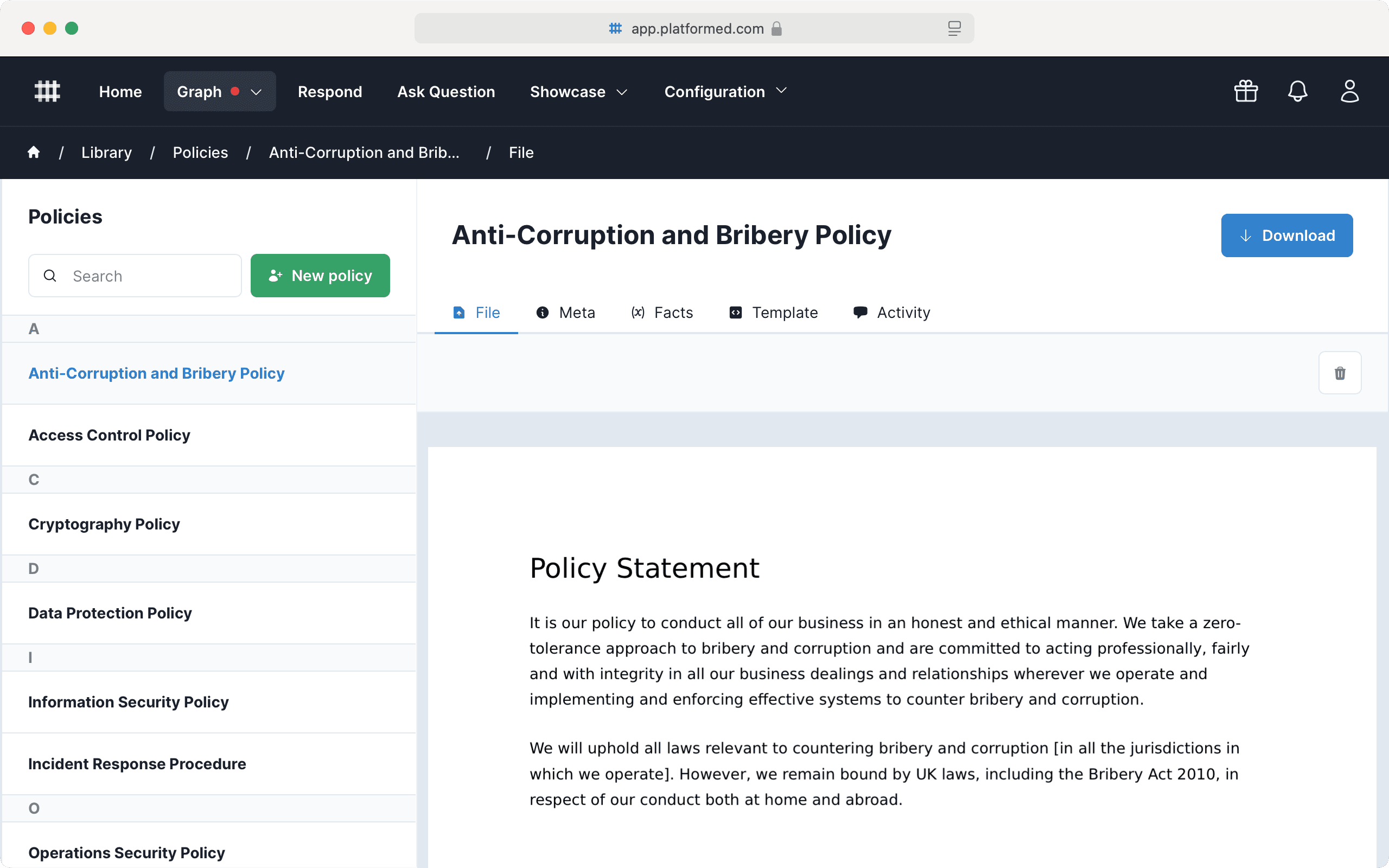 Platformed’s powerful AI has you covered. Our platform’s “brain”, Graph, pulls information from across your business, and automatically organizes it - including structured information from your CRM and GRC tooling, and unstructured information like PDF documents and entries from your wiki. Graph constantly analyses information, identifying stale or conflicting data and surfacing it for automatic or manual remediation.