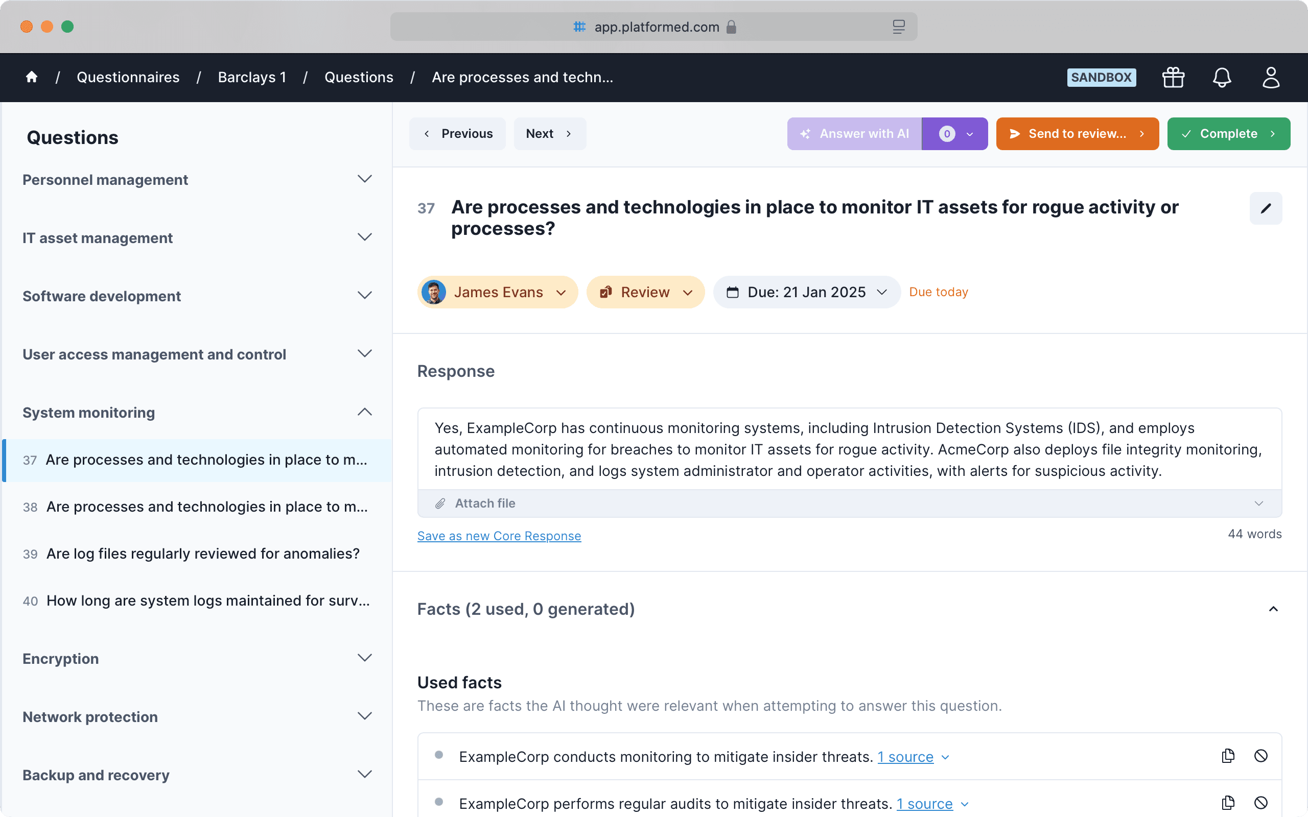 Platformed offers consistent, high-quality, AI-driven responses with a self-maintaining knowledge base that never goes out of date. Complete questionnaires accurately up to 68% faster with Platformed.
