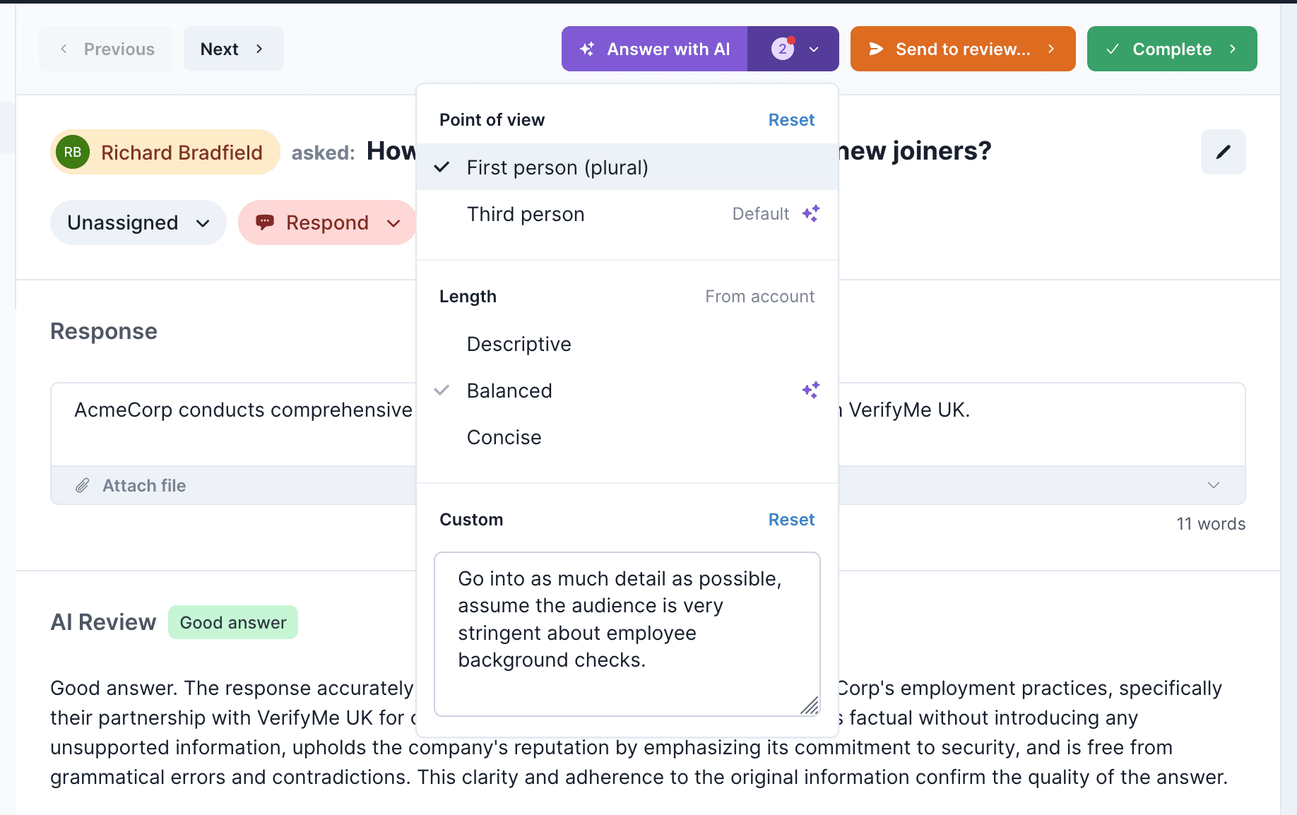 Platformed was built to run with powerful AI from inception rather than an afterthought. With the most advanced AI capabilities on the market, Platformed goes beyond Q&A-type RFPs/DDQs, and scans your entire knowledge base of facts to provide the best response. Enjoy the freedom of setting up custom prompts, word count limits, and more.