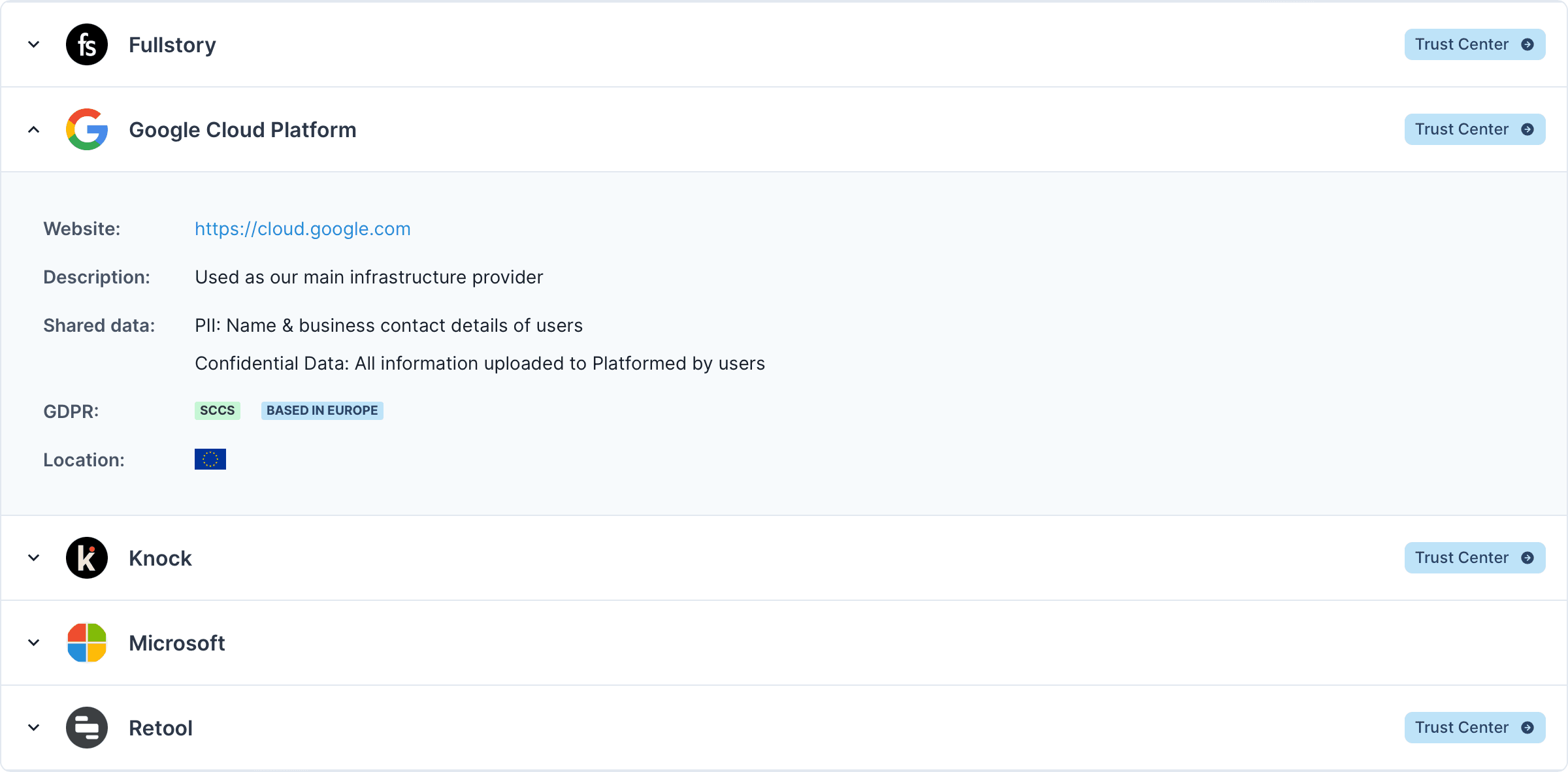 Point your customers to a live list of subprocessors that notifies them of changes automatically.